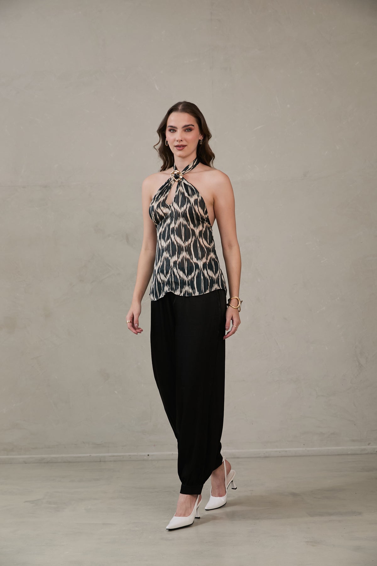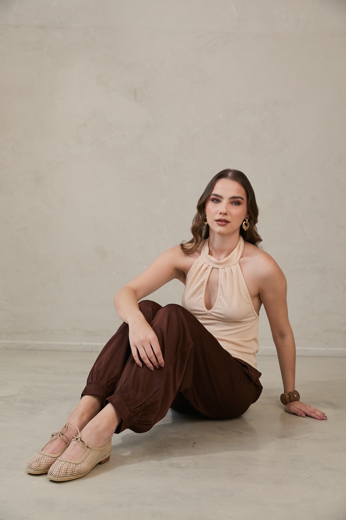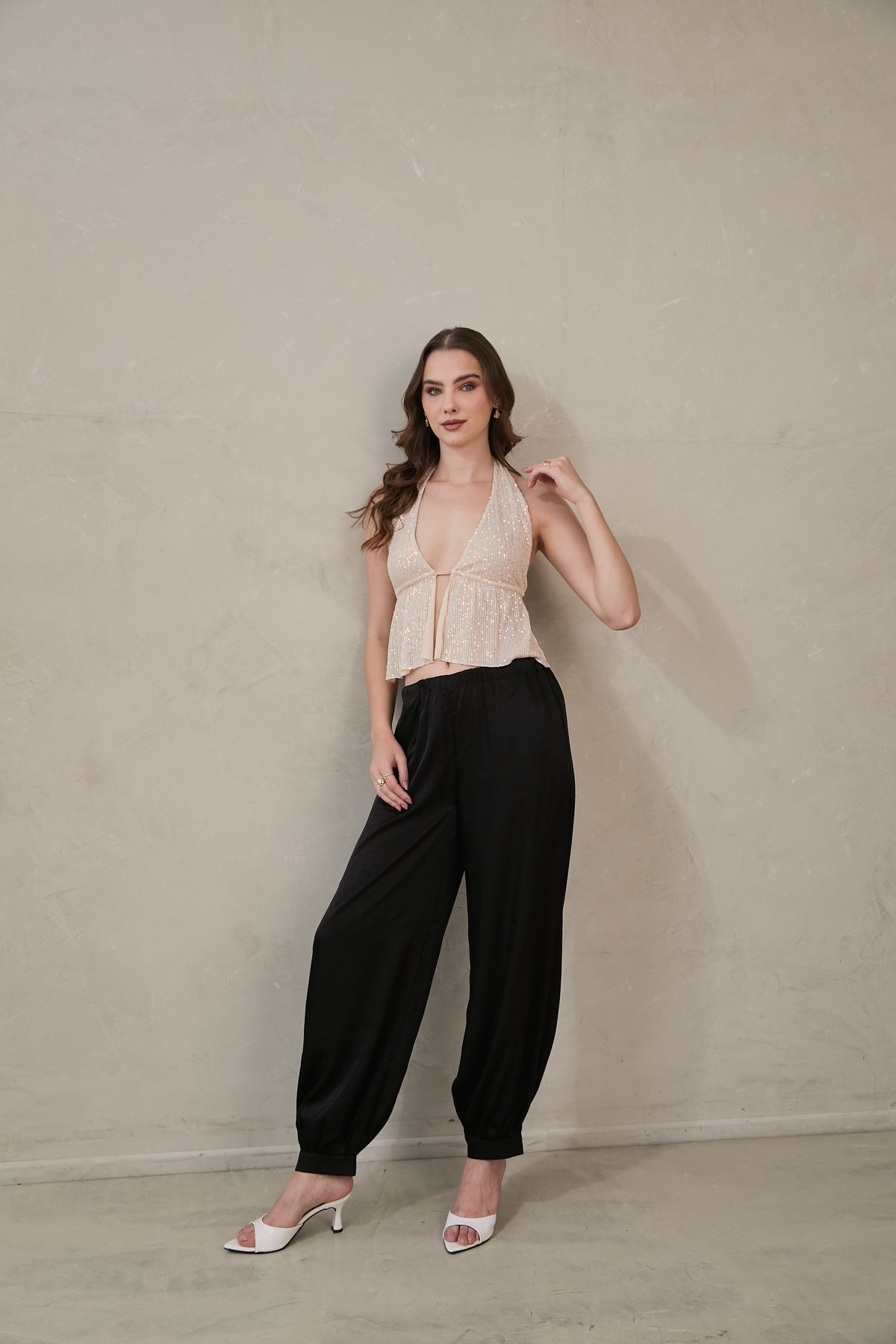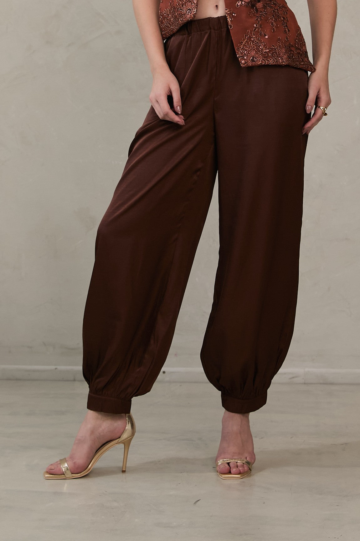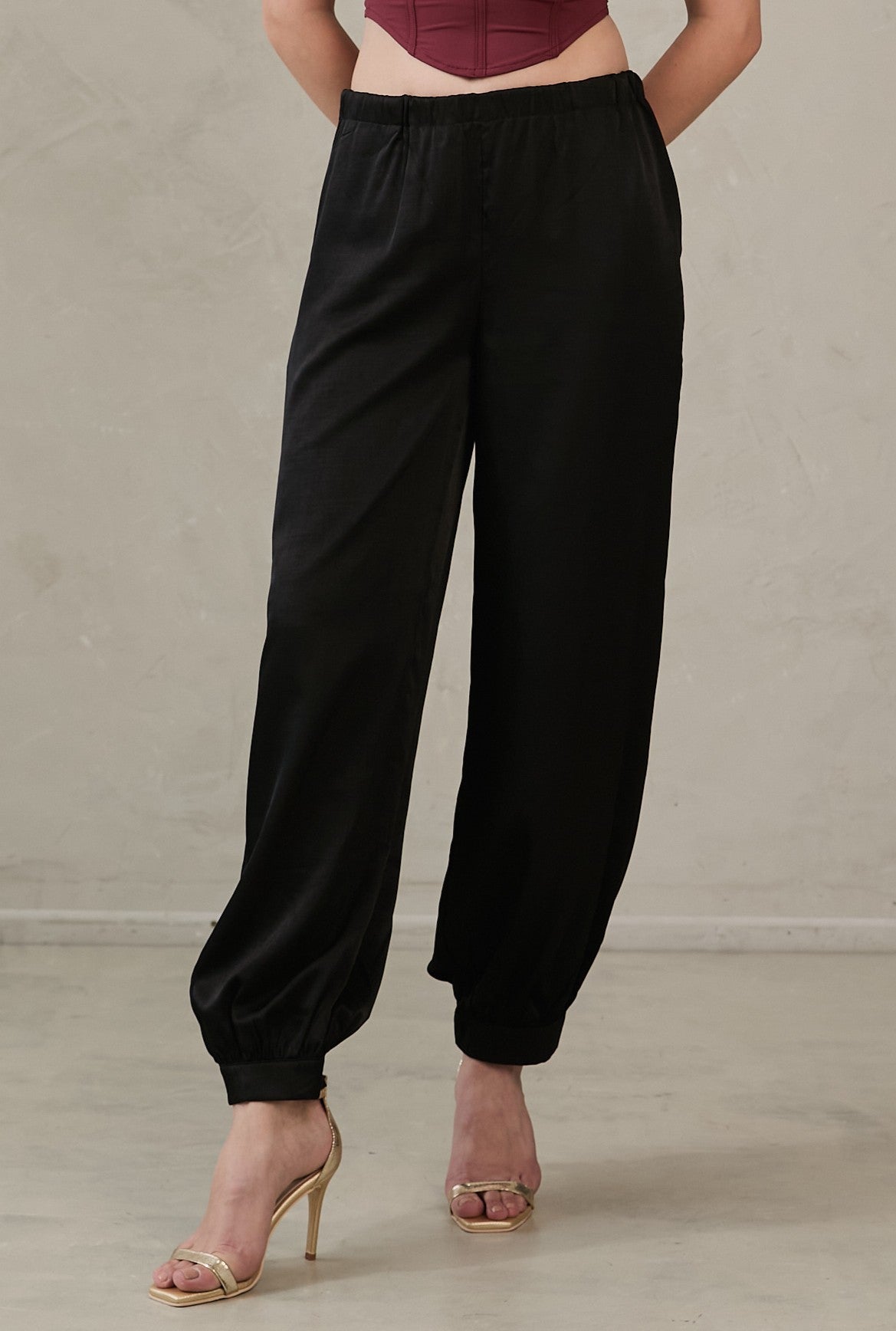 Pantalón de tiro medio con pretina elástica. Pierna recta-relajada y bota con un efecto levemente fruncido. Acabado satinado; disponible en marrón y negro.