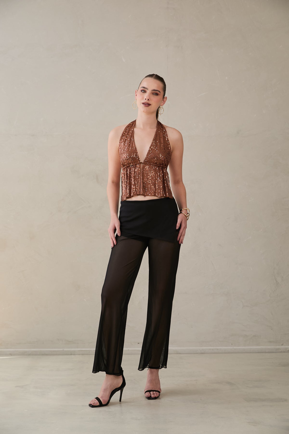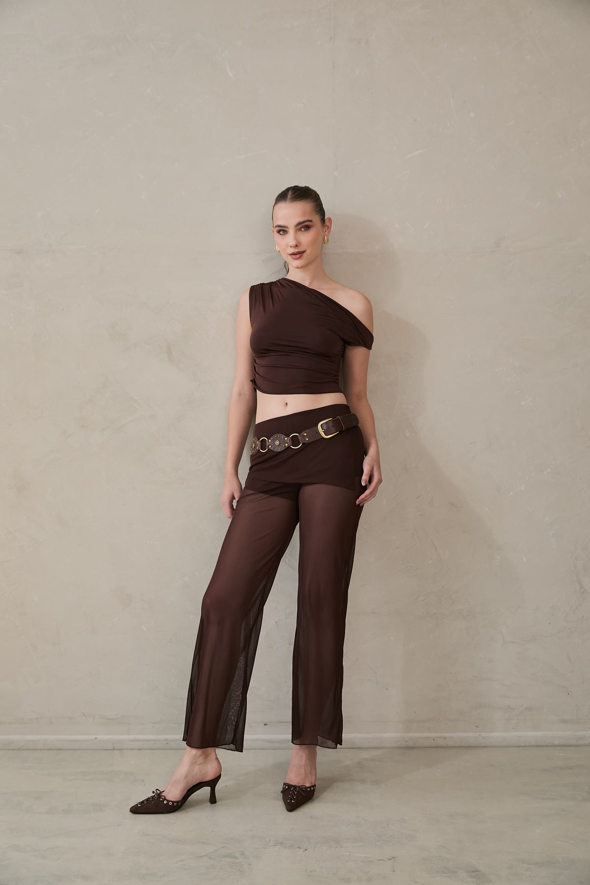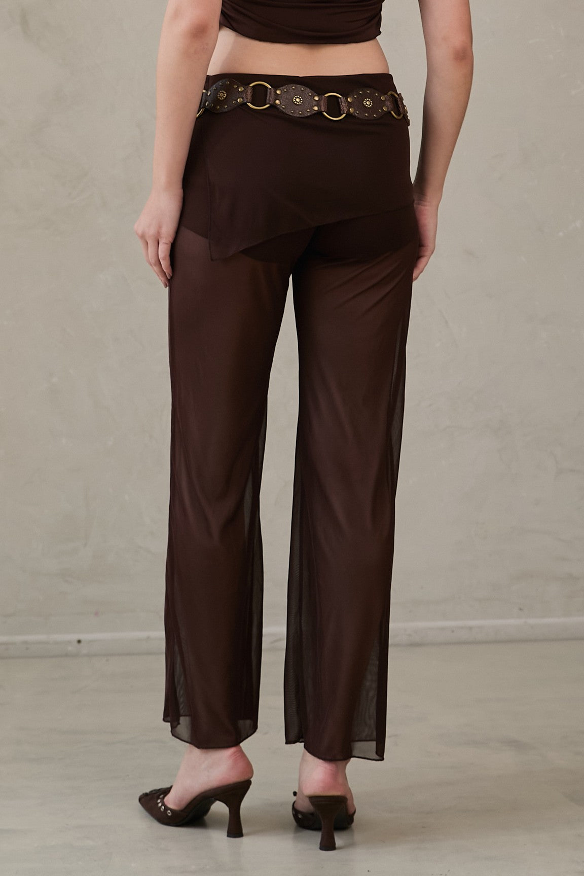 Pantalón con fajón alto en punto que se pliega suavemente sobre la cadera. Piernas rectas en malla translúcida, caída ligera y bota suelta. Disponible en marrón y negro.