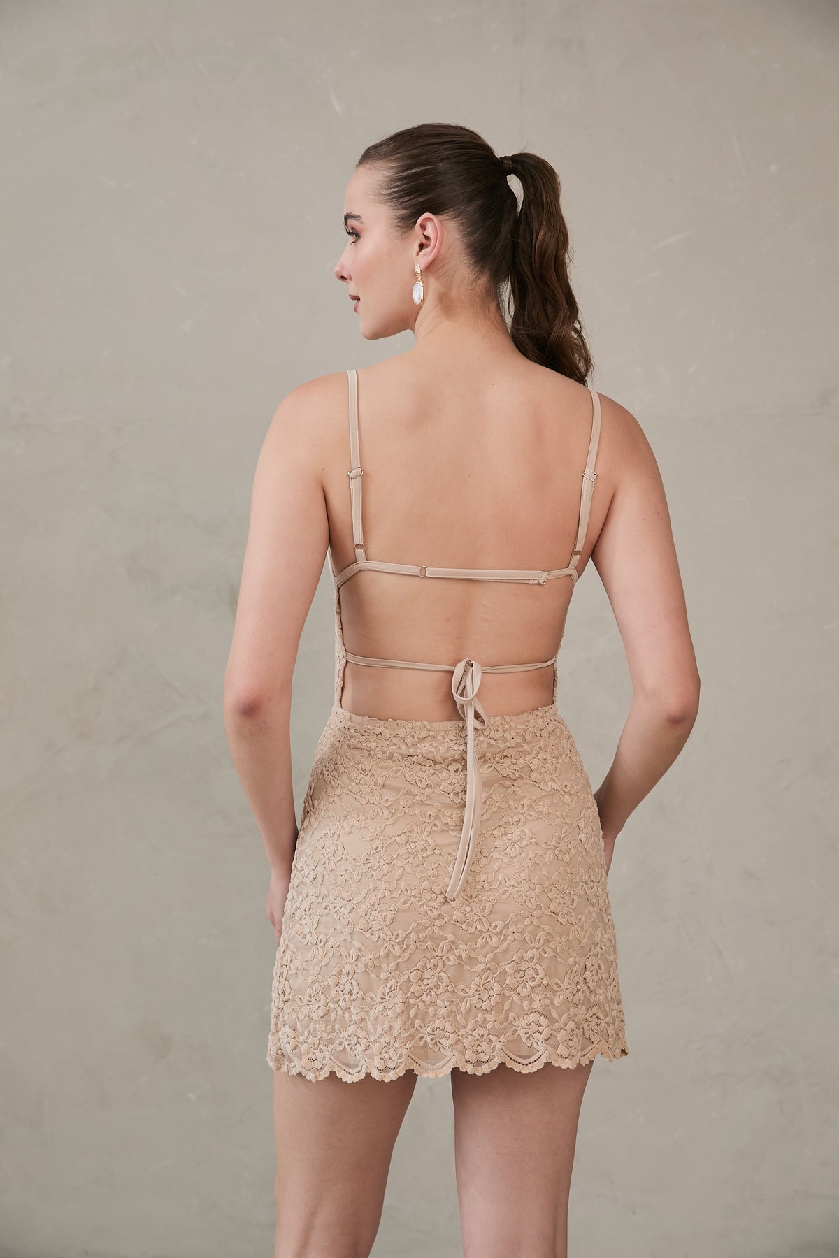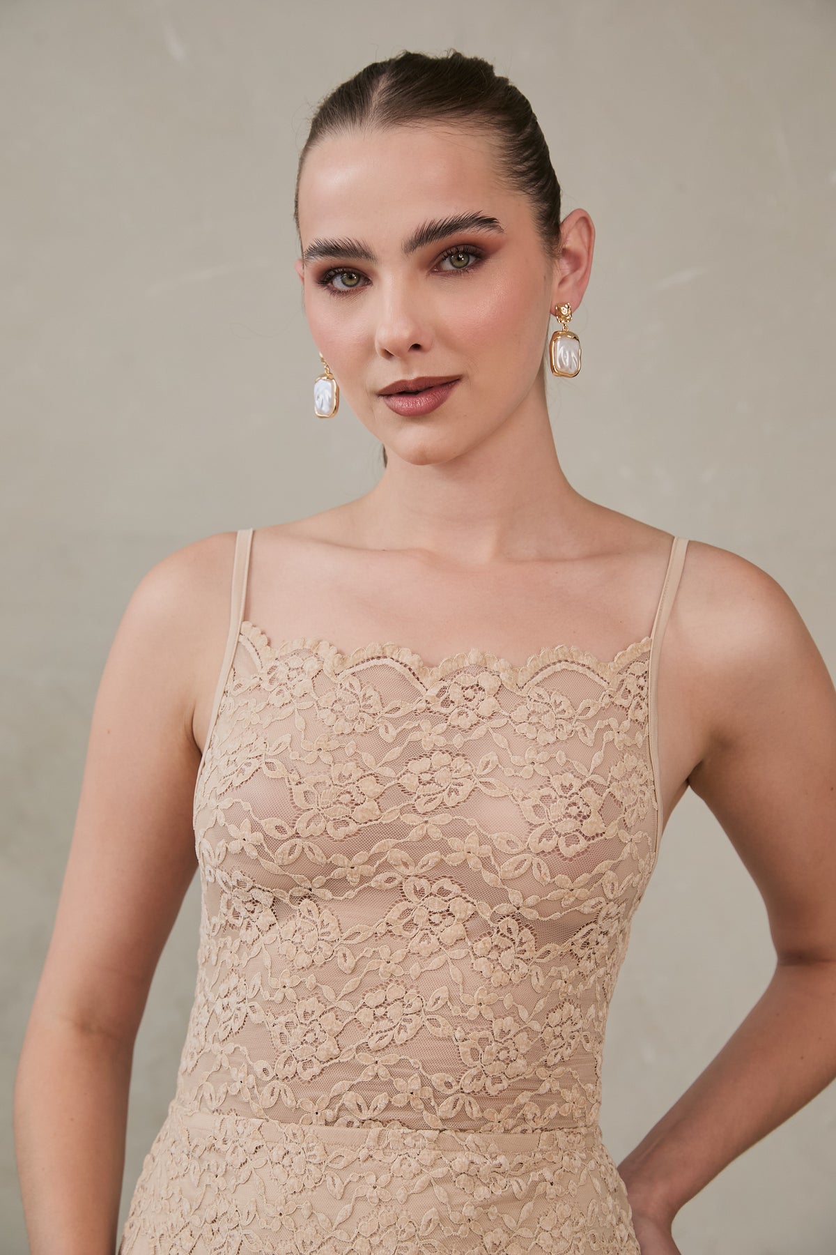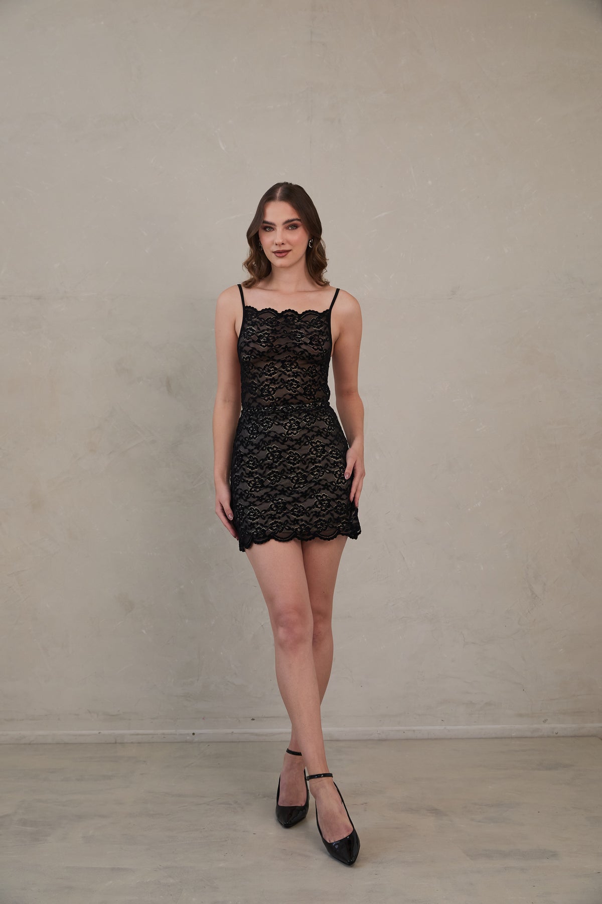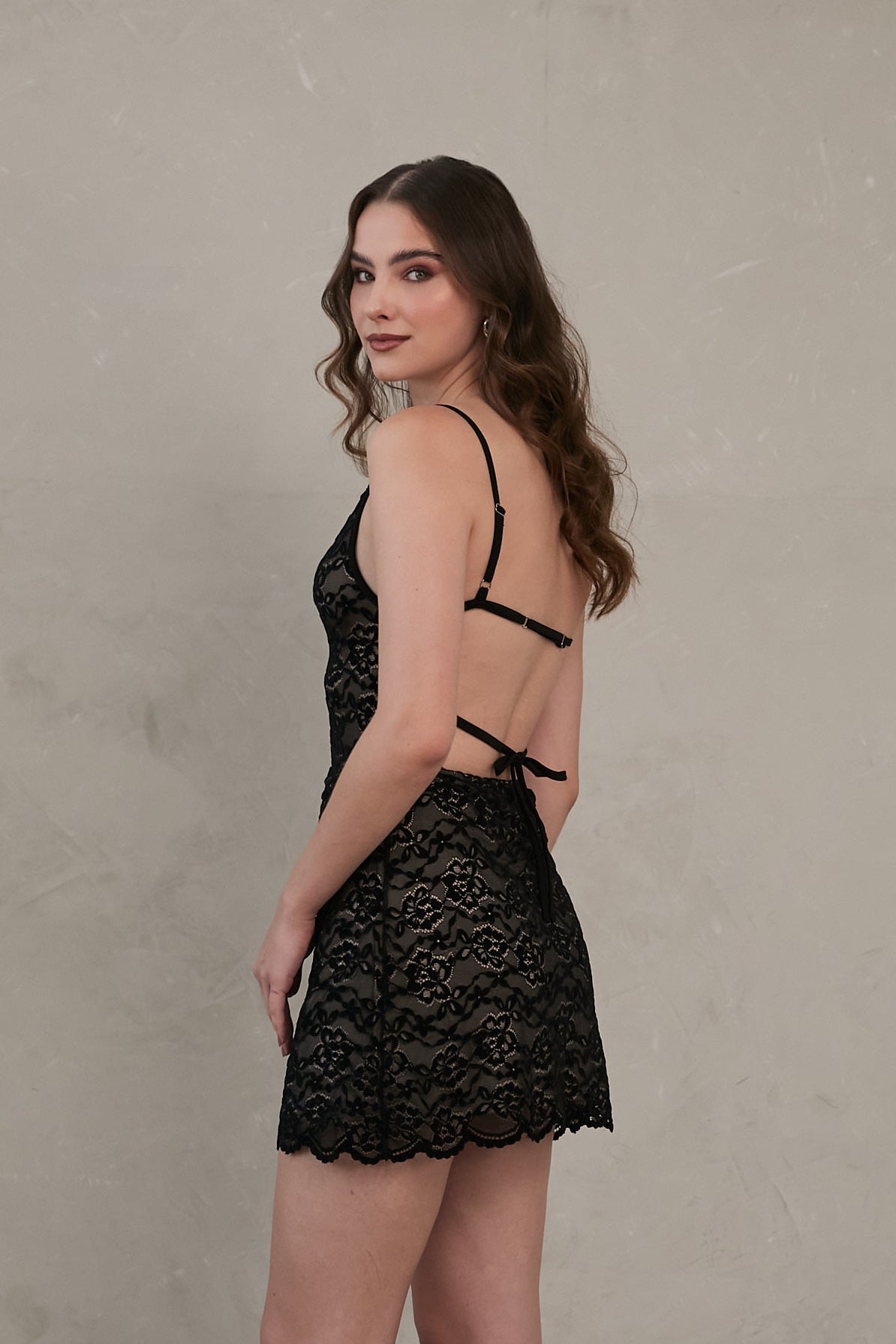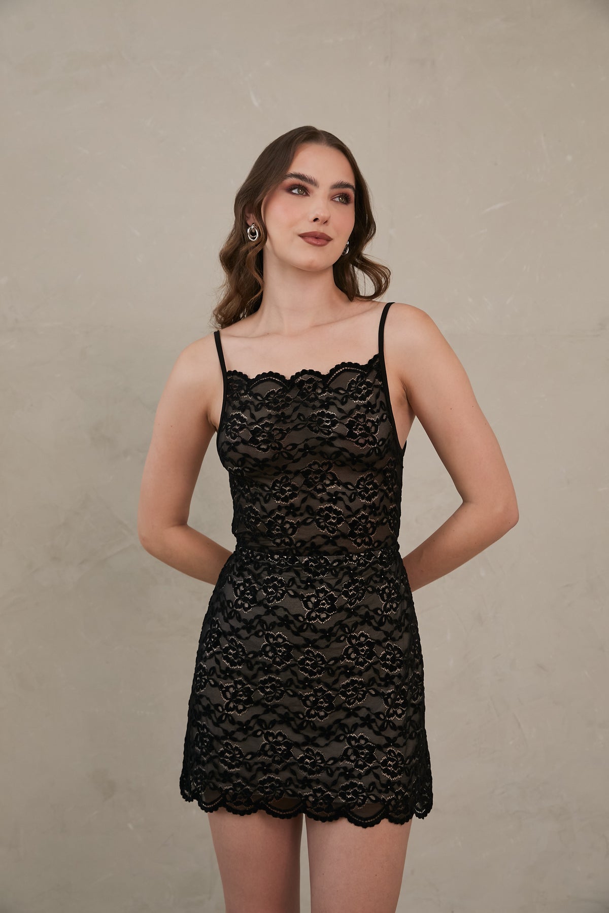 Vestido con tiras delgadas y escote recto. Cuerpo en encaje floral con terminación festoneada en bajo; lleva forro liso en la falda para mayor cobertura.